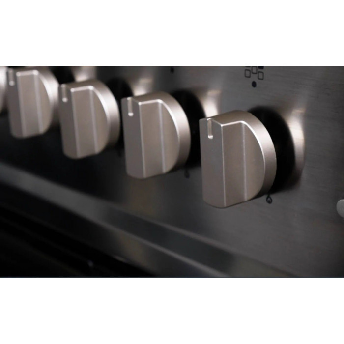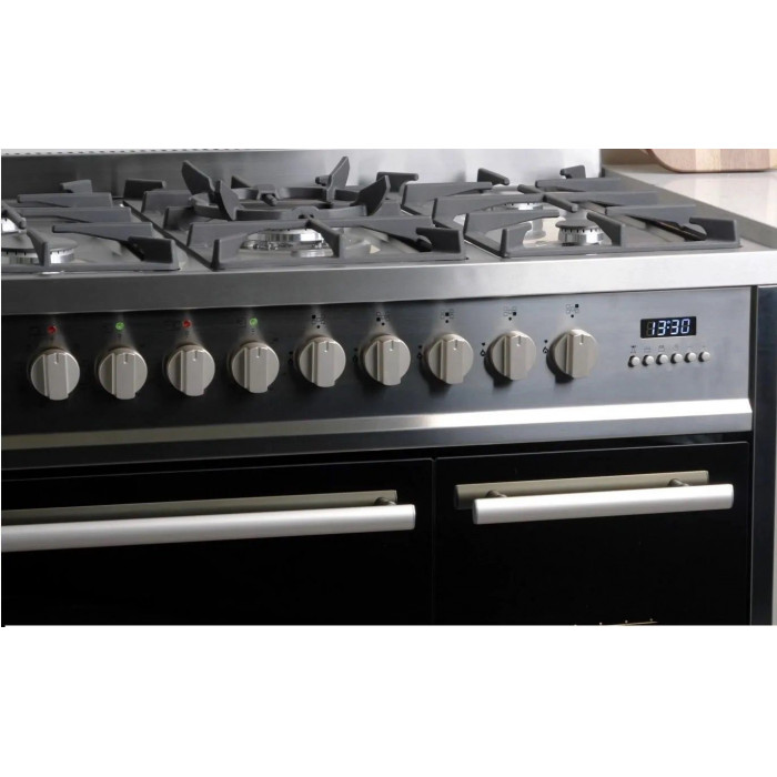 Gas Elektro Standherd 90 cm in in Edelstahl mit zwei Backöfen.